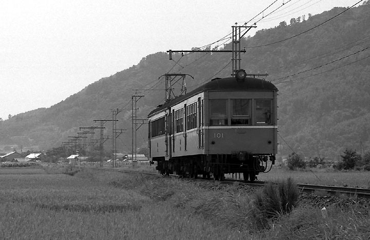 別れ出雲大社の 門前に向かう支線もあり、今は山陰地方唯一の私鉄となっています。起点の「松江しんじ湖温泉」は、私が訪ねた頃は 「松江温泉」といってお り、更にその前は「北松江」と称していました。私が一畑電鉄を尋ねたのは1971年8月のことでした。 今からもう30年以上も前のことですが、当時は吊り 掛け車のオンパレードで、しかも地方には珍しい「特急」も運転されて いました。途中どこか宍道湖沿いでユースホステルに泊まった記憶がありますが、それが どこだったか・・・??写真は 例によってスナップ中心ですが、一昔前の地方私鉄の姿、よろしければご笑覧下さい。 |
