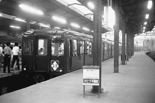今から40年以上も昔の事でございました。新幹線は既に新大阪まで開業して、0系が 「ひかり」に「こだま」に大活躍して、大阪は千里の丘で開催されていた万国博覧会に 首都圏から沢山のお客さんを運んでおりました。ヨウヤク夢の新幹線が庶民にとって 現実の新幹線になり掛けた時代でした。しかし、周遊券を頼りに旅をする鉄道大好き 学生さんにはマダマダ高嶺の花だったのでございます。ソノ頃首都圏から九州への 行き帰りは、往復とも2泊3日が常でした。行きは143M(夜行大垣行き普通列車)で 私鉄に興味があれば名古屋下車、近鉄経由で大阪へ到着後、関西で夕方まで鉄して 九州方面への夜行急行に乗車して翌朝到着と言ったぐわいでした。アップの写真も そんな鉄旅の最中に撮った、近鉄上本町地上ホーム40数年前のスナップなのです。 今では駐車場にした屋根にスッポリ覆われ空の見えない上六も、こんなに開放的な ターミナルだったんですね。ホームに停車中のク1590形がぶら下げている方向板の 上本町抜き「大阪」単独の表示も、マルーン単色も今となっては懐かしい限りです。 近鉄大阪線 上本町 1970-8 Photo by 団長 |