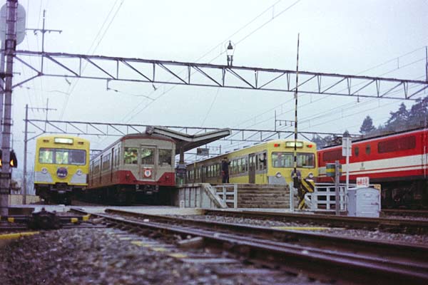 毎度毎度のピンボケ写真でお届けする駅撮り探検団は、1969年の開業から2年目の 秋を迎えた、西武秩父線横瀬駅でございます。鉄の間で今横瀬と言えば、隣接する 横瀬車両基地で年一で開催される「西武トレインフェスティバル」有名ですね。GEやら ブラウンボヴェリーやら、静態保存のお宝輸入電気機関車ナンカも拝めるですから。 そんな静態保存機が現役バリバリの当時、横瀬駅に集う西武秩父線貨客の主役は、 西武初の本格的山岳路線に対応させた走行機器を備えた101系、側面だけ出演の 私鉄界最大F級電気機関車E851、いずれも当時最新鋭の車両達でございます。でも 本当の主役は違いますね、賢明な駅撮りファンの皆サンなら分りますよね、101系の 間に挟まれた車両、40年前の当時でも最古参の311系制御車クハ1311形なのです。 しかし、旧国払い下げの311系まで秩父線に入線していたとは!流石に新造車両の カルダン駆動701系の制御車クハ1701形にTR11を履かせた、西武でございます。 西武秩父線 横瀬 1971-10 Photo by 団長 |