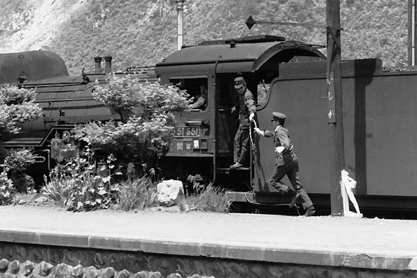 今から約40年も昔の事でございます。アッシは数人の鉄仲間と一緒に合宿の下見と 称し、山陰地方を巡っておりました。その頃は、米子鉄道管理局とそれに接する隣接 管理局の線区上で顔を上げれば、架線の無い広い空が広がっておりました。特急や 急行の優等列車は、無煙化されておりましたが、今や語り草となった布原三重連を はじめ、蒸気機関車が、通勤列車や貨物列車の先頭ではマダマダ煙を上げていた エリアでございました。新幹線の岡山開業後に電化されて陰陽連絡の幹線となった、 振り子電車381系で運用された特急「やくも」が、1時間ヘッドで走っている伯備線も 例外ではございませんでした。その伯備線石蟹駅でD51牽引の貨物列車が雑多な 貨車を連ねて進入して来た時のことでした。腕木は場内、通過ともに下がっており、 貨物列車は速度を落とし、機関助士がキャブから身を乗り出しタブレットをホームの らせん状タブレット受けに投げた後、新見までの新たなタブレットを引っ掛け損う! こりゃ大変っと思ったら、運行安全確認でホームいた駅員さん、タブレットを拾うと 猛ダッシュでカマを追いかけ、玉は無事に機関助士さんに渡ったのでございました。 今流行のATCはスンバラスィ〜けだど、物理的に形のあるタブレットを持って無いと 次の閉塞に進入出来ないお約束の方が、安心できるのはオジサン鉄だからかな? 伯備線 石蟹 1971-5 Photo by 団長 |