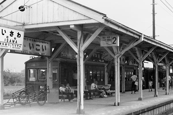 まだ小海線に貨物列車が、走っていた頃の事でございます。夏になると高原野菜の 出荷に合わせC56の野菜臨貨が、毎年走っておりました。その野菜臨貨を目当てに 小淵沢に向かう途中、停車した石和で車窓から撮ったスナップが、これでございます。 写っているのは旧型国電はクハ47でしょうか?だとすると、相棒は32系の成れの果て クモハ14なのかな?ホームに置いてあるリヤカーや白線入り学帽を被ったベンチの 学生さんも茶色の旧国に似合う駅風景ですね。更に、画面左上の駅名票を御覧あれ、 「石和」も今じゃ「石和温泉」になり、隣の「べつでん(別田)」は「春日居町」ってナンカ らしくない駅名に変わっちまいました。台車はホームに隠れ車体は支柱で串刺しとは、 ググってヒットする「正しい駅撮り」と正反対の「正しくない駅撮り」なのでございますが、 学帽被って吊り掛けで通学したオジサン鉄には、嬉し恥ずかし懐かし風景なのです。 中央本線 石和「石和温泉」 1968-7 Photo by 団長 |