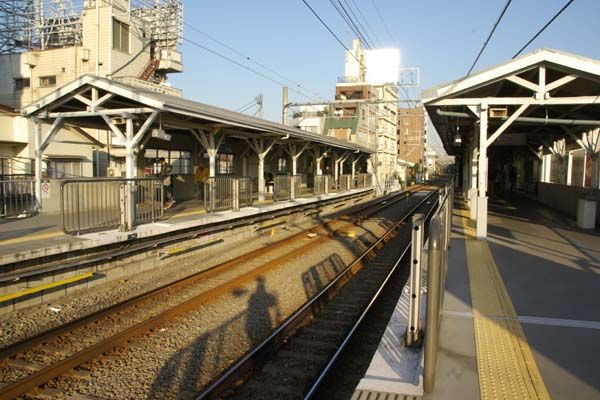 端からホームだけのカットで失礼致します。てぇ事は、今回は殆ど駅を撮り探検団で お届けなのでございます。むかし、旧3000系が老体に吊り掛け音を響かせて活躍を していた頃、線名と同じ曲名の「池上線」と言う歌がヒットしたのを覚えていますか? それから、35年余の月日が流れ旧3000系は消えてしまったけれど、東急各線中での 昭和の面影が駅施設に色濃く残っているのが、池上線の各駅、洗足池もそんな駅の 一つなのです。オジサン鉄の目が和む木製の梁に上屋、ワンマン化で立てた鉄柵が 無ければ、今にも旧3000系が走って来そうじゃございませんか。盛り土上に造られた