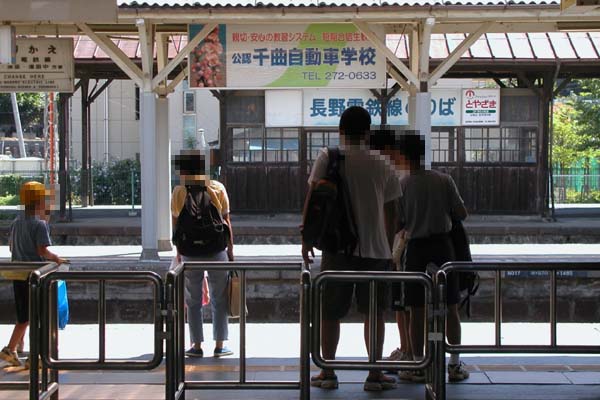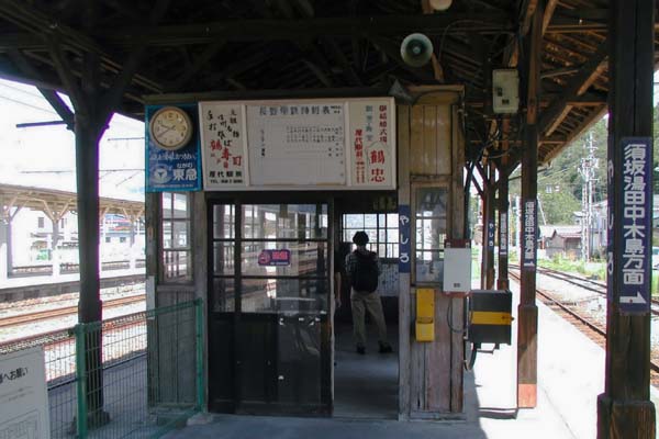 跨線橋は、幅の狭い木造トラスに華麗に変身するのです。床板の軋む音を聞きながら 木造の感触を楽しみつつ、屋代線のホームに下りると其処は、期待に違わぬ昭和の