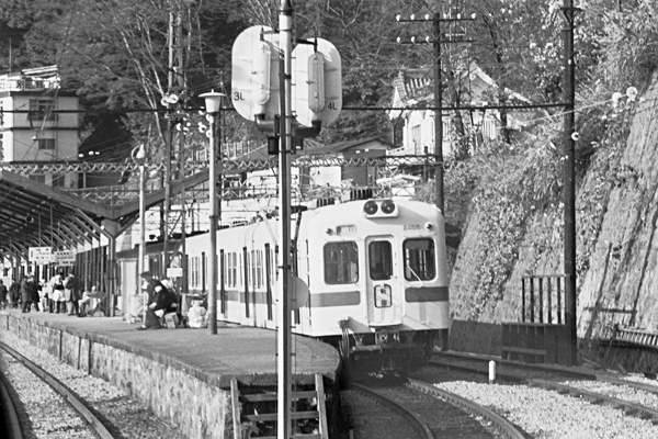 ホーム先端がファインダーに入っているアングルって、こりゃあ線路内立ち入り掟破り 駅撮り探検団、なんて事はございません。写っている車両を見りゃお分かりですよね。 そう、今回の駅撮りは、箱根湯本に到着する小田急3100系ロマンスカー展望席から 撮ったワンカットなのでございます。2012年4月にペデストリアンデッキが、出来上がり 目出度橋上駅として新装開店と成った箱根登山鉄道の箱根湯本駅ですが、44年前は ホームは石積み、木製とラーメン構造の架線設備に懐かしいハエタタキと、70年代の 駅風景を見せておりますね。その駅で出発待ちの列車はコレマタ懐かしい、小田急の 2400系HE車急行新宿行き4連なのです。この頃の小田急は、確か2600系NHE車6連 快速準急小田原行きと2400系4連+2400系4連(又は2200系)の8連箱根湯本行きの 急行(後ろ4両は相模大野で分割急行江ノ島行き)が、共に30分ヘッド運転だったと 思います。今じゃ箱根湯本まで新宿から直通するのは乗車券のほかに余分な料金を 払わなきゃ乗れない列車ばっかり、駅も新しくなったし車両も綺麗になったけど、昔の ダイヤの方が、ビンボ〜人に優しいかったと思うのは、アッシだけでしょうか? 箱根登山鉄道 箱根湯本 1970-11 Photo by 団長 |