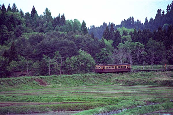 腐った発色超祖粒子ネガカラーでお届けは、毎度お馴染み撮影地ガイドとしては全く 役立たずの廃線駅撮探検団シリーズ、蒲原鉄道の高松駅に入るモハ71でございます。 もっとも、○○シリーズって言ってはみたものの、殆ど1回目でおわっちまっているんで このシリーズも2回目があるかどうか、ってなところでございます。国鉄から煙が去って 数年後の1979年、月山へ春スキーと洒落込みました。休鉄状態とはいえ、幾分かの 鉄分が体内に残っていたんでしょう、往路は山交三山線の跡を辿り、帰りは日本海を 羽越本線に沿って下り、五泉に出て、蒲原鉄道を見ながら17号を南下して来ました。 その時撮ったのが、今回アップした「一様」高松駅を入れたカットですけど、「一様」と お断りしたとおり、100%の確信が持てないのです。グーグルマップやネット上にある 画像に情報から推測した結果なのでございます。今も昔も変わらない撮影データーを メモら無い適当さは、アップ時のコメを書く苦労のタネなのですが、ネットで情報を探し 撮影場所を調べるのって結構楽しいのでございます。 蒲原鉄道 高松 1979-5 Photo by 団長 |