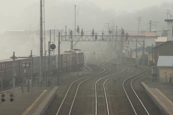 睡魔に負け朝の撮影を駅撮りで妥協してしまったのが、良かったのか、悪かったのか、 ホテル窓を開けると街は朝霧に包まれていました。森駅に着き2番線函館方面先端に 向かうべく跨線橋に登りホームを見下ろすと、これがまたナカナカ宜しい眺め、なにしろ 非電化の函館本線ですから邪魔な架線がございません。早速跨線橋からの駅撮りに 変更も、この朝霧の中でドウヤッテ撮影するか、日進月歩のデジカメなのに自分のは、 8年も前に製造された化石の様なカメラなのです。しかし、朝方の函館方面逆光条件が 回避されたので、如何やら朝霧の発生は吉と出た様でございました。いつもなら多少 フォトショップなんぞでイジル画像も今回は撮ったまんま、ラーメン桁にズラリと並んだ 信号機、青現示で出発するDF200の貨物列車、遠くにポツリ見えるライトは7:38分着 「北斗星」なのでございます。普段はライトを拾うとピントが合わない年代物のカメラが、 霧のベールでライトを程よい合焦点のターゲットにしたのでございました。 函館本線 森 2014-5 Photo by 団長 |