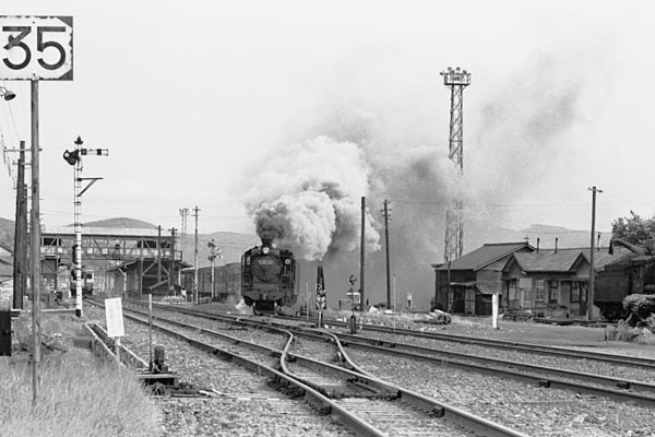ミナサン大雪崩れって聞いた事ありますか?地平の札幌駅から四方に出発して行った 夜行列車をホテル代わりにして、煙を追いかけたオジサン鉄なら、オ〜1527レかぁ〜 懐かしいなぁ〜、って思ったんじゃないでしょうか。前夜札幌を22:15に発車した517レ 網走行き夜行急行大雪5号は、北見到着後DD51からC58にカマを換え、列車番号も 1527レと変わり終着駅網走を目指したのでございました。列車種別は普通になっても マニ+スユニ+オロハネ10にハネ2両+スロを含んで組成された編成は、北見で数両の ハザを落とすも、何所からどう見ても急行列車そのものなのです。その大雪くずれの 先頭に立ったのが、蒸気機関車C58なのですから、鉄が放って置くハズございません。 極一部のお金持ち鉄は、北見や美幌に泊まりタクシーを使って1527レを撮りましたが、 大多数の鉄のお宿は、大雪5号のハザなのでございます。自分の乗車して来た列車を 撮る訳なんで、ここは必然的に駅撮りしか選択肢がございません。そんな事で撮った 写真が、大雪くずれ美幌発車の一コマでございます。 石北本線 美幌 1974-6 Photo by 団長 |
