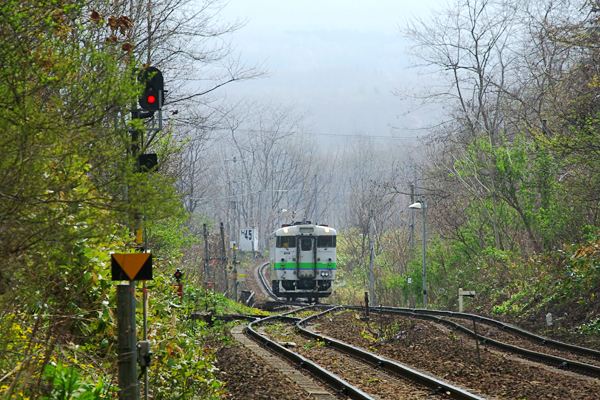 晴れてりゃ、バックに駒ケ岳がボンヤリ?も駅撮りするにゃナカナカ宜しい駅が、今回 駅撮り探検団でご紹介の函館本線大沼回りにある、姫川でございます。無人駅ながら、 上下線を挟んで対向式ホームを備えた交換可能駅、停車客扱いするのは、上下とも 僅か1日5本のローカル列車だけでございますが、さすがに本線上の駅特急や貨物が、 結構な頻度で来るんで、退屈するこったぁ無いと思いますよ。SL大沼号撮影で訪れた この時も8時チョイ過ぎに着いて、大沼号の通過が10:40頃、その間に写真の各停を 含め、特急に貨物レ上下合わせて6本の列車が、撮れたんです。しかし、この姫川は、 列車以外で訪れるのが、かなり困難を伴なう秘境駅ベスト50にランキングされている、 正真正銘の秘境駅なのでございます。でも、この姫川駅は、函館本線と平行している 国道を走る車が、ホームから手に取る様に見えるのでございます。国道との距離僅か 50m程なのに出られる道が無い、コリャ姫川は、秘境の駅じゃなくって卑怯な駅?。 函館本線 姫川 2014-5 Photo by 団長 |