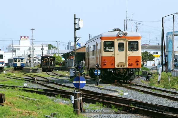 今年最後の駅撮り探検団は、年の瀬とは何の関係も無い茨城交通時代の那珂湊で 撮ったスナップを御笑覧頂きます。今じゃ大人の事情で3セクひたちなか海浜鉄道と なっちまったけど、那珂湊は、湊鉄道の昔から現在も変らない中心駅でございます。 木造駅舎に2面3線のホーム、併設されている機関区、昭和の鉄道情景を色濃く残す オジサン鉄には堪らない駅なのでございます。その那珂湊を発車して勝田に向かう 元国鉄キハ20のキハ205、その上り列車と交換して阿字ヶ浦に向かうは、旋回窓が トレードマークの北国育ちキハ22と同型元羽幌炭鉱鉄道キハ222、中線に停車中の ホキも渋いですねぇ。これで信号が、腕木ならなんて贅沢かな。 なかみなと海浜鉄道(茨城交通)湊線 那珂湊 2005-5 Photo by 団長 |
