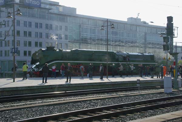 思鉄団員共々地球を半周して、ドイッチュランドのドレスデンに来ております。なので 当然今回の駅撮りは、現地より撮りたてホッカホッカの写真をお届けしようかと思い ましたが、言葉も儘ならぬ外つ国での鉄ゆえナニが起こるかも知れず、此処は一つ 安全策で去年(2014年)撮った元DR東ドイツ国鉄の怪物蒸気機関車18 201などを ご紹介いたします。この18 201、元は戦前のドイツ国鉄DRGが造った、ヘンシェル製 61型タンク蒸気機関車を戦後東ドイツ国鉄DRが、マイニンゲンでテンダー機関車に 改造した1両1形式試作機といった塩梅のカマございます。そして何の為の試作かと 申しますと、これが高速運転なんですね。ナント18 201、3つのシリンダーと2.3mの 動輪で叩き出す最高速度は時速180kmなのでございます。そんな事でドイツの鉄な 人達が沢山18 201の周りにいる訳なのです。 Deutsche Bahn Dresden Hbf 2014-4 Photo by 団長 |