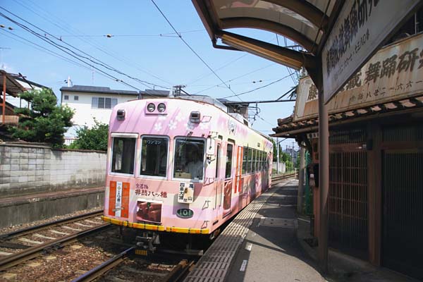 千年の都と称えられる京都、悠久の歴史溢るる街でございます。そんな京の街を走る 鉄道は、やはり専用軌道と路面を出たりのトラムラインが宜しいのです。8両・10両と 長い編成の高速鉄道は、間違っても似合わないのでございます。時勢の波に呑まれ、 75km超の路線を誇った市電を廃止してしまった今、京の街に残ったトラムラインは、 京都電燈の忘れ形見、嵐電こと京福嵐山線・北野線と大人の事情で別会社となった 叡電こと叡山電鉄しかございません。ってな勝手な思い込みでお届けする駅撮りは、 嵐電太秦広隆寺駅に到着のモボ101形なのです。専用軌道から束の間三条通に入り 広隆寺門前を通ると直ぐ専用軌道に戻る、嵐電有名撮影ポイントの最寄り駅ですが、 記憶では駅名はタダの太秦だったはずなのに、いつの間にか「広隆寺」が追加されて おりました。まあ、「業平橋」から「とうきょうスカイツリー前」なんかと比べりゃよほど 罪は無いんですけどねぇ。しかし、ホームに直結の粋な格子戸の町家の玄関、それも 藤間流の習い事の町家なんて、戦前生まれ吊り掛け駆動のモボ101にゃお似合いの 駅風景なのです。 京福嵐山本線 太秦広隆寺 2008-8 Photo by 団長 |