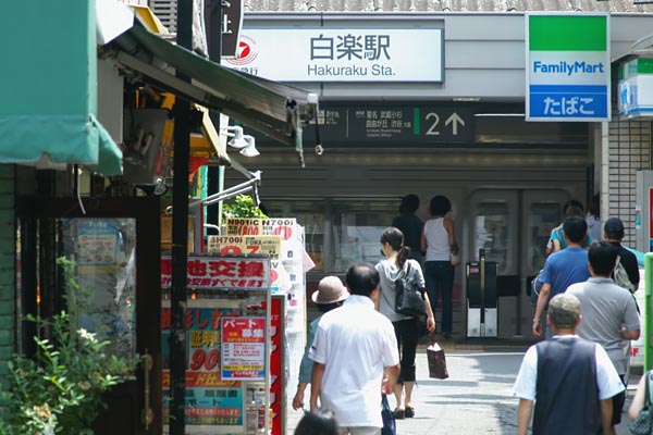 十年一昔とは良く言ったもんで、本当に世の中10年も経っちゃうと、イロイロと代わる ようでございます。モチロン我らが鉄道業界もカメラ業界もご他聞に漏れないのです。 ってな訳で、今回の駅撮り探検団は、10年前に訪れた東横線白楽を御笑覧頂ます。 横浜市の住宅密集地域に設置された白楽駅は、相対式2面のホームを持つ橋上駅、 大都市圏じゃ何処にでもありそうな中間駅なんですが、上りホームと構外の道路面が 同レベル(元からか嵩上げしたかは不明)となっており、写真のとおり構外から平面 移動のみで上り列車へ乗降可能な構造なのです。ホームに入って来たのは渋谷行き 各停の9000系、現在は5両編成に組み替えられ、大井町線で運用されておりますが、 10年前は、特急から各停まで活躍した、東横線主力車両でございました。ラッチの 外に掛けてある駅名表示板左側の半欠けコーポレートマークの下に「急行」に文字が 書いてあるのが、見えますか?略称の東急電鉄も10年前はまだ「東京急行」でした。
