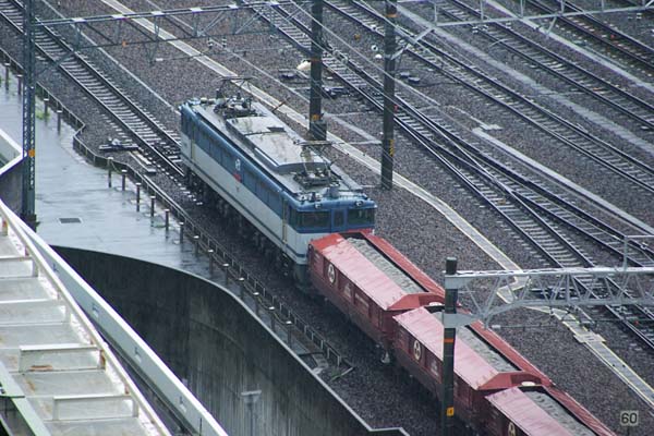 今度は左に振って斜め下にレンズを向けて、EF65牽引の東海道本線上り貨物列車。
