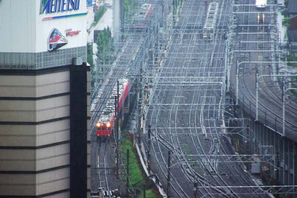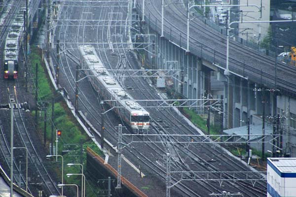もう少しレンズを上にすれば、右からチラリ新幹線700系、東海道本線311系。名鉄は 6000系でしょうか?雨天ガラス越しで露出厳しく、1/100で絞り7前後の為ブレボケの 方は御免蒙ります。なお、スカイストリートは鉄な立ち台に非ず、長時間占有も三脚も 当然ご法度でございます。 東海道本線 名古屋 2008-8 Photo by 団長 |