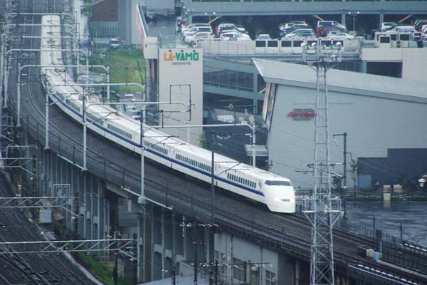 鉄な写真の中でも俯瞰っとくりゃ、チョイット憧れちゃうシチュエーションなんですけど、 山道をエッチラオッチラ登ってなんて、モノグサ思鉄に出来る訳ございません。しかし、 街中バックで良かったら駅ビル俯瞰なんて事が出来ちゃうんですね。エレベーターや エスカレーターで駅ビルに登って撮れちゃう、苦労いらずの駅撮り俯瞰は、思鉄にゃ ピッタシの撮影シチュエーションなのでございます。そんな都合の良い撮影ポイントの 一つが、名古屋駅JRセントラルタワーズ15Fにあるスカイストリートなのでございます。 嬉しい事にこのフロアーは、無料のパブリックスペース、撮影は当然ガラス越だけど、 寒暖雨天無縁で楽しめちゃうのでございます。線路を見下ろして右側にパンすれば、 ファインダーに今は無き新幹線300系が、テレ端(35mm換算)450mmで引っ張る。
