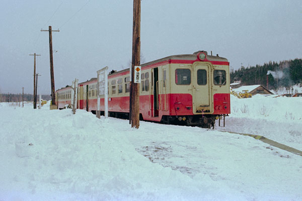 今年も早いもので後一月半、北国からは、雪の便りも聞こえて来る季節となりました。 そこで今回は、1月以来の雪景色駅撮りをアップでございます。雪の積もったホームで 発車を待つは、キハ12 10と20の2連、十勝三股9:20発帯広行き724Dでございます。 寒冷地仕様キハ12は製造僅か22両、合造車を除けば10系気動車では、結構レアな 車種じゃないでしょうか。なにせ全車が北海道に配属されていた為、実車を撮るにゃ 大枚叩いて津軽海峡渡らなきゃならないんで、ビンボ〜鉄の身の上には結構厳しい ハードルがございました。そんなキハ12も煙突からの煙が見える十勝三股の集落も 消えっちまいましたね。思鉄考えるに、ローカル線無煙化に貢献した10系気動車って 産業遺産としての価値十分と思うんですけど、キハ17も12もJR各社での動態保存は 当たり前の様に無し、お陰でキハ12 23なんてマガイ物が、出現しちゃうんですねぇ。 国鉄 士幌線 十勝三股 1976-2 Photo by 団長 |
