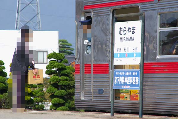 停車してドアが開くと、車内には山積みの段ボール箱が見え、ホームには荷物持った 人が、乗務員さんとなにやら会話中なのです。でも、長電のチッキ扱いなんて何処を 如何調べたって出てこないのです。この段ボール箱の正体はイッタイなんなんだろ?