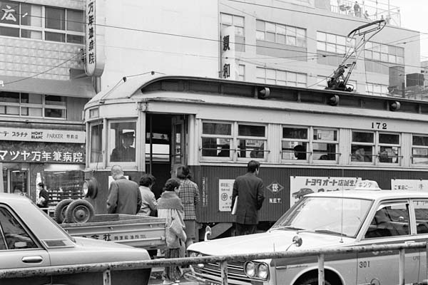 今回の駅撮り探検団は、お久し振りの電停撮りでお届けする、長崎電気軌道は1系統 五島町でスナップした尻切れトンボ170形のアラアラ写真でございます。生れながらの ビンボ〜鉄、行きたい所数々あれど懐具合常に厳しく、東京近辺以遠出る事叶わず、 鉄道雑誌を見て鉄な思いに耽る詰襟時代でございました。そんなアッシに千載一遇の チャンスを与えて呉れたのが修学旅行、それも九州という太っ腹な目的地に喜び勇み 出掛けたのです。しかし所詮学校行事の団体行動、移動手段は全て貸切バスなんで 車窓から線路が、駅が、車両が見えたって、アッシ一人だけ降りて鉄するナンテ当然 叶わず。出来るのはバスの窓からスナップぐらい、そんな状況であわてて撮ったんで 半欠け写真となってしまい、オマケに電停の名前も不明でしたが、グーグルマップと 背景の「親和」の看板がヒントとなり、五島町電停と推測したのでございます。だけど、 ストリートビューで現在の五島町電停付近を見ると、170形の停まっているが、本当に 47年前の五島町電停なのかイマイチ自信が持てない、街並みの変わり様なのです。 長崎電気軌道1系統 五島町 1969-3 Photo by 団長 |