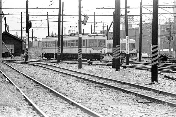 1年前(2015年)の北陸新幹線開通及び高架化工事因って激変してしまった富山駅が、 国鉄北陸本線主要駅だった昔々は、40年ほど前に恐らく国鉄富山駅1番線から撮った 電鉄富山へ到着する地鉄電車の駅撮りでございます。右に左に傾いた木製架線柱を 縫う様にして入ってくる、2両編成は14720形のモハ14721+クハ721でございます。その 後ろに見えているのは、地鉄初のカルダン駆動の高性能電車両運車14771のクハを 電装したモハ14772、増結運用の為電留線に待機している様ですね。画面手前の線路 2本は国鉄、地鉄と繋がっているのが判りますか、当時宇奈月・立山への交通手段は 鉄道が主力、大阪から475系急行「立山」、名鉄神宮前から、犬山線・高山本線経由で 名鉄キハ8000急行「北アルプス」などが、富山駅構内にあった連絡線を使って地鉄に 乗り入れておりました。大阪から、名古屋から、窓を開けて風に当たり、駅弁を頬張り、 沿線風景を愉しむ旅は、今じゃ思い出の中でしか出来ない旅になっちまったようです。 北陸本線 富山 1976-8 Photo by 団長 |
