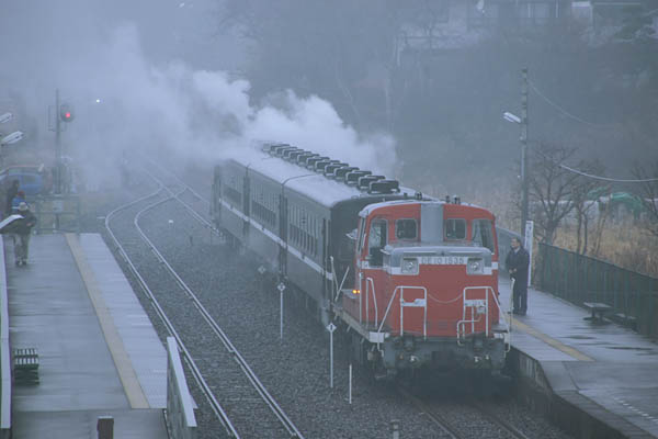 8年ほど前の冬に行った真岡鉄道、その日最初に撮った折本駅上り側に架かっている 歩道橋からのスナップが、今回の駅撮りでございます。雪が降るほど寒かぁ無いけど 氷雨上がって白霧に包まれた写真撮るにゃあまり宜しくない空模様ではございますが、 モノは考えよう、滅多にない霧中の鉄も良い経験と、開き直っての撮影となりました。 ホームにはC12を後ろにぶら下げた、DE10先頭のもおか号送り込み列車が先に入線