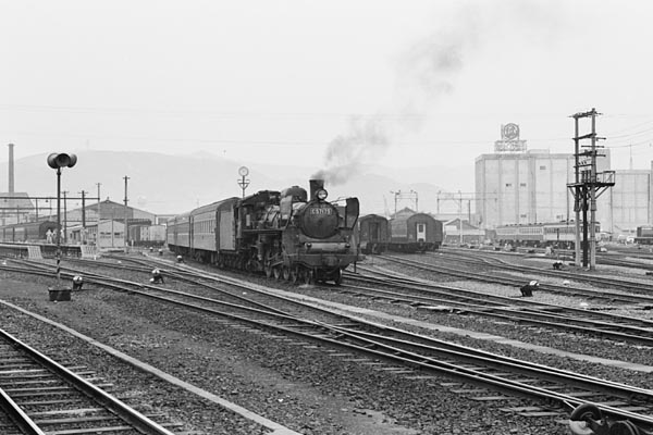 架線の無いスッキリとした構内で押し込み作業中のカマは、早岐区のC57 175号機、 後に鹿児島機関区へ転属、日豊本線のSLさよなら列車を牽いたカマでございます。 押し込まれている旧客は、如何やら急行列車用の編成らしいけど、当時の時刻表が 見つからず特定できないのです。奥の方には、留置中の20系や急行色のキハ26系と 10系気動車ですね。バックの建物屋上の’マルハ’マークも懐かしい、非電化時代の 長崎駅ホームから撮った、長崎機関区の風景でございます。駅ホームから隣接する 運転施設が、心置きなく撮れた国鉄時代に一度だけでいいからタイムスリップしたい っと思うは、ジ〜サン思鉄のノスタルジーなのでございましょうか? 長崎本線 長崎 1969-3 Photo by 団長 |