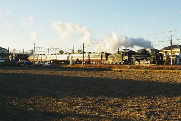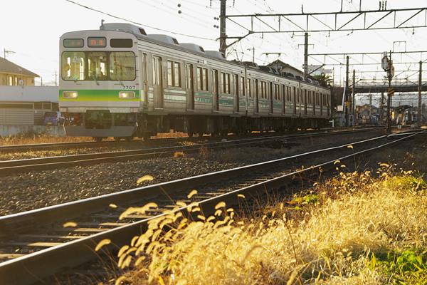 パレオの来るまで30分となり、熊谷よりの踏み切りに移動して待っていると、東急から 来た元8090系の7500系が、半逆光の陽の中を出発していきました。真冬の日暮れは 早くって15時を半分過ぎりゃ夕焼の様、ツマンナイ銀箱電車も黄昏気分となりました。