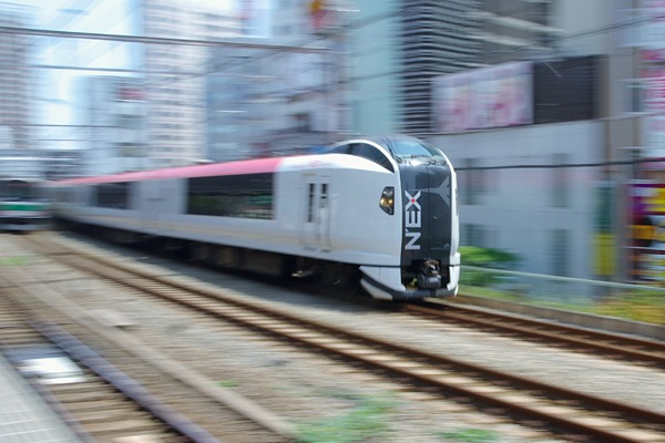 動きのある被写体を撮る時、普通はブレを防ぐ為に速きゃ速いほどシャッター速度を 上げて撮影致します。走行中の列車なんてぇのも、そんな被写体の一つでございます。 駅撮りでも通過する列車はもとより、停車する列車も制動・信号技術の向上など昔に 比べてかなりの速度でホームに進入して来るんで、それなりのシャッター速度で撮影 致します。だけど、いつも同じ様なアングルで撮るだけじゃ飽きちゃう、なんて思ったら 流し撮りなんて撮り方は如何でしょうか?開けた場所から望遠気味の焦点距離にして 撮る方が楽なんですけど、駅撮りじゃそうは問屋が卸しません。ふんじゃ流し駅撮りは どんな駅が宜しいかと言うと、複々線区間で通過線にゃホーム無し、カーヴでもありゃ 更に良してぇとこでございましょうか。そんな駅の一つ五反田で撮ったE259系NEXの 先頭部分だけ止まった、流し撮りと言うにゃチョット情け無い駅撮りでございました。 山手線 五反田 2013-6 Photo by 団長 |