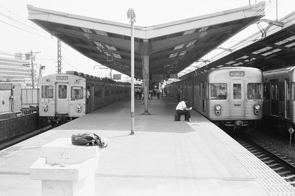 今では大手に中小更にはJR各社、全国各地で普通に見られるステンレス製車両が、 然程一般的でない時代の東横線中目黒での駅撮りでございます。左は客扱いを終え 発車する、日本初のオールステンレス車東急7000系急行桜木町行き、右には営団 日比谷線セミステンレス車3000系東横線日吉行き乗り入れ車。っと、此処までコメを 書いてはみたけど、その後が出てこないのでございます。長考末に思い出したのが、 当時のダイヤの事でございました。相互乗り入れ先が、副都心線に代わる直前には 18mX8と20mx8の差なのか、30分ヘッドとなっていた日比谷線乗りれ列車、50年前は 東横線、日比谷線共に18mx6の編成だったからか、日吉で折り返しの乗り入れ車は、 データイム1時間に5本の12分ヘッドでございました。東横線の急行も昼間は、同じく 12ヘッドだったんで、乗り入れ列車は上下線とも中目黒で必ず接続しておりました。 ってな訳で、無理矢理ジ〜サン鉄の口癖’昔は良かった’に持ってちゃいました。 東急東横線 中目黒 1967-9 Photo by 団長 |