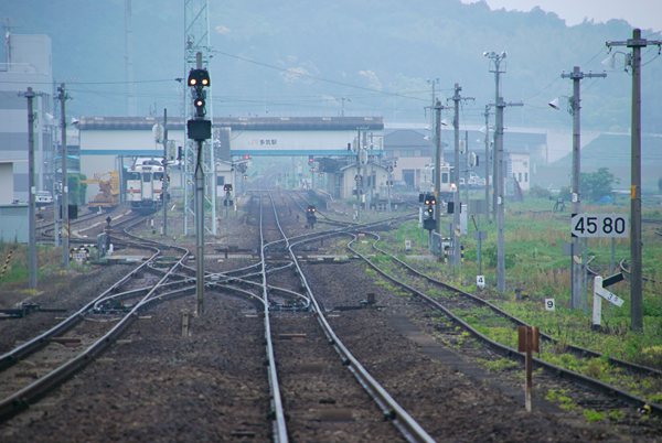 多気は紀勢本線と参宮線の分岐駅、左側の列車は上の写真に写っている、当駅発の 亀山行きキハ48でございます。そのキハ48の停まっている1番線に向っている進路が 紀勢本線、やけに高い入換え信号機の右側の線路が、参宮線伊勢方面から多気への 進路でございます。やはり片面ホームの棒状駅や単純な交換駅よりポイント・信号機・ 標識類なんかがある分岐駅てぇのは、駅全体見るだけでもナンカわくわくするのです。 そして多気と言えばダイヘンの専用線、写真一番右側の速度制限標識「80」の下側に 見えるレールが、そのダイヘン三重事業所へ向う専用線なのでございます。参宮線と