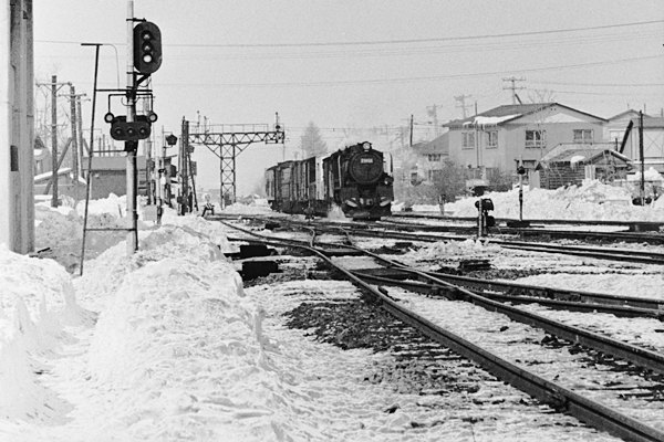 今回は久し振りに銀塩古ネタでお届けする、駅撮り探検団でございます。なので当然 今同じ様な駅撮りは出来ない、ジ〜サン思鉄が昔は良かった、って愚痴る為だけに アップした役立たずの駅撮りスナップでございます。除雪した雪が汚れて凍りついた 駅構内に進入して来たのは、キューロこと大正生まれの古豪9600型蒸気機関車に 牽かれた貨物列車を’○○駅でスナップ’の駅名を失念のカットなのです。こうなると 先ずは、ネガを見て前後のコマに写っている被写体ナンカから捜索を開始致します。 すると、前のコマに帯広の駅名表示板を発見したんで、何の疑いも無く素直に撮影は 地平時代の帯広駅したんだなっと思い込んじゃったんですねぇ。しかし実際にネガを スキャンしてモニターで見ると、帯広にしちゃぁ周りの風景がやけに寂しい。今も昔も 十勝地方の中心都市、40年以上前だって人口13〜14万位の筈なんで、気になって 再調査致しました。そこで9600の機番から当時の庫を調べると29694は、北見区の 所属だった事が判明、士幌線か広尾線と思っていたのは、池田に到着する池北線の 貨物レでした。最初っからちゃんとメモってりゃコンナ間違いしないで済むんだけど、 昔の写真を見ながら色々調べて撮影した場所を特定するのって、やってみると結構 嵌っちゃうのでございます。 根室本線 池田 1974-2 Photo by 団長 |