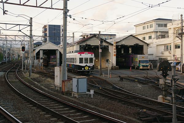 夕闇迫る四条通をを横切るは、京美人夕子ちゃんのラッピングがチャームポイントの 嵐電モボ633を京福西院駅上りホームでスナップした駅撮りでございます。左に見える ホームは、四条通南側に相対式に設置されていたホームを下りだけ四条通の北側に 移設して、今年(2017年)から使用したものなんです。普通ホームの移設なんてぇっと、