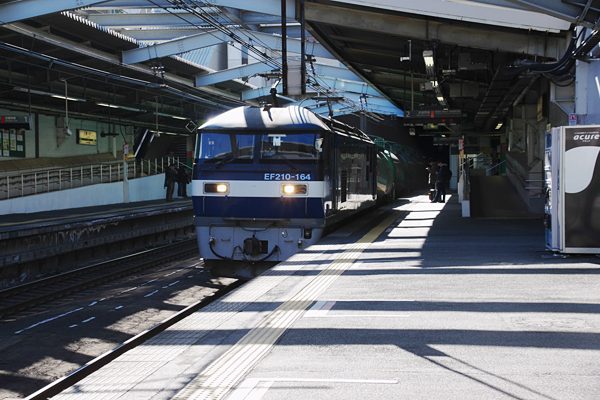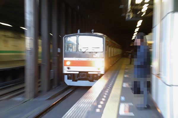 新性能電車登場後に新規開業した武蔵野線は、全線を通して踏切がございません。 なので、トンネルに高架や掘割と、あらゆる手段を駆使して道路との交差を交わして 線路を敷いてるんですね。そんな武蔵野線で駅撮りするにゃ条件残念な駅が、掘割に 設置されたうえ、上下線ともトンネルに囲まれちゃった新小平なのです。その新小平で 降りたのは、近くを並行して走る西武多摩湖線で旧色の新101系を撮る為なんだけど、 降りたら直ぐに通過列車の案内が。武蔵野線で通過列車っとくりゃ、貨物レ?臨時? ナニがくるかお楽しみなのです。こうなるてぇと、撮影条件なんて構っちゃられねぇやで 撮ったのが、EF210の貨物レでございました。程なく今度は下り列車接近のアナウス、