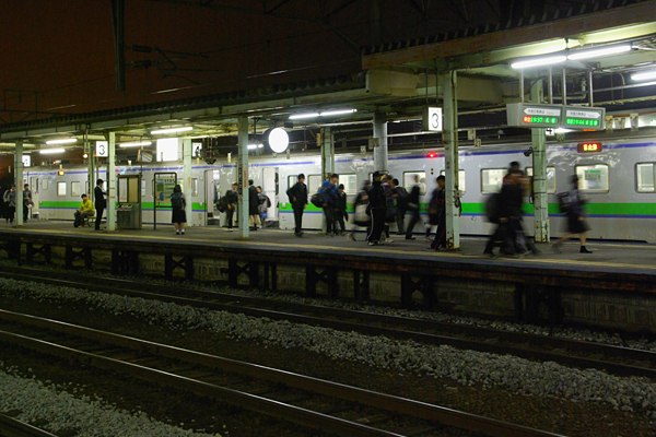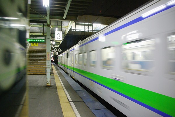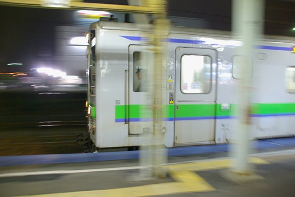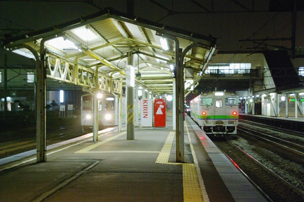 鉄旅なんぞの非日常空間に身を置いちゃうってぇっと、普段はめんどっちいんで中々 やらない夜の駅撮りなんてぇ事をしちゃうのでございます。大概は駅傍の安ホテルに 泊まってる時に近くで晩飯食った後、何故かふらりと駅に向かってそのまま駅撮り、 なんてぇのが、お決まりのパターンなのでございます。そんな旅鉄の一夜に苫小牧で 撮ったスナップをアップしちゃいました。19時半過ぎ、苫小牧駅4番線に東室蘭からの キハ143 2連の各停が到着、ホームは学生さん達で溢れる・・・迄はいかないものの、 それなりの下校風景が展開いたします。乗客が退いた3・4番線ホームに降りてみると