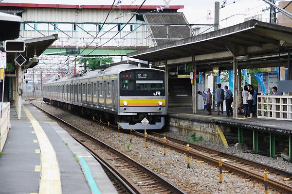 今回も前回に引き続き南武線駅舎撮りシリーズ、第2弾は既に高架化されてしまった、 南多摩でのギリギリ間に合ったぜ、地平ホーム駅撮りでございます。2番線停車中は、 仙石線に転属前の205系1200番台横ナハ48編成の川崎行きでございます。205系の 停まっているホームの向こっ側には、ほぼ完成した高架化工事に伴う線路移設で使う 仮跨線橋や仮ホームが、写ってますね。次に上りホームから下りほーを見るてぇっと、