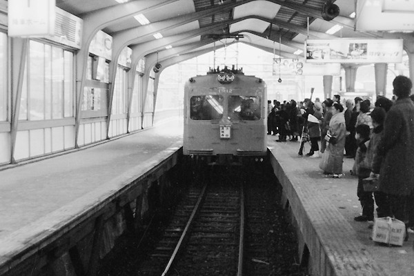 東横線地下化を幕開けとし、GWには地下鉄銀座線さえ停止しての渋谷駅再開発は、 現在もそのラビリンスで働くオト〜サンやオネ〜サン達の行く手を阻んでいるのです。 もっとも、40年も50年も前から判り辛くって有名、なんてたって地下鉄なのに3階から 出発しちゃうんですから。そんでこの前、国電なんて呼ばれてた頃の山手線渋谷駅を アップしたんで、今度は昔の井の頭線渋谷駅をご覧頂きます。現在はマークシティに 飲み込まれ、その2階から出発する列車は、空を見る事も無く渋谷隋道に入り神泉に 向っている井の頭線でございます。写真の吊り掛けグリーン車1900形が入線して来る 頃の井の頭線渋谷駅は、ホーム、集改札口が今よりも山手線よりにあったんですよ。 丁度、今の西口前の道路んところにガーター橋が架かっていて、橋より10m位手前が ホームの先端でございました。それでも乗り換えにゃ、かなりの距離を移動しなっきゃ ならなかったんです。それなのに東横線は地中深く潜り、一番近かった銀座線さえも ホームは山手線の内側に移動しちゃう工事の真っ最中なんですぜ。お陰で昔よっか 乗り換えが、不便になっちゃう再開発って一体なんなの? 京王井の頭線 渋谷 1967-2 Photo by 松原の親方 |