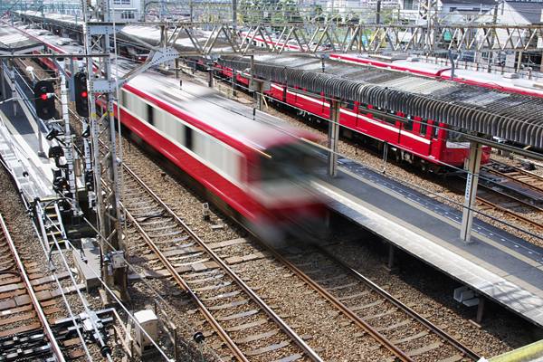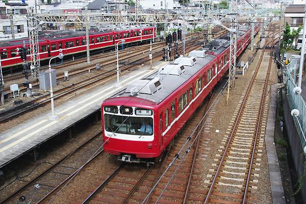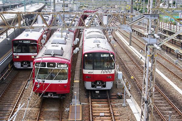 今回の駅撮り探検団は、首都圏辺りの鉄分豊富な方やそうじゃ無い方にも評判高い 京急神奈川新町でございます。配線は追い抜き可能な島式2面4線のうえに隣接して 検車区があるんで、始発・終着・車両交換に入換えなどなど、運転扱い現業作業が 次々と目の前で行なわれっちゃう、鉄な人にとっちゃホント堪えられない駅なのです。 そんな神奈川新町の子安方面に駅構内を跨ぐ歩行者線用の橋が、線路に沿ってる 公道上から架かっているのでございます。ってな事で、ホームから撮ってるだけじゃ 飽きちゃうんで、その歩行者専用橋からのスナップをご紹介です。先ずは山側から 下り方面、4番線に1500系川崎行きが停車中、隣にゃ800系が品川の方向幕表示で 出庫転線待機中、その横を通過する構内入換え運転中の新1000系でございます。