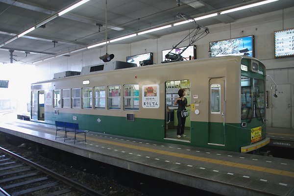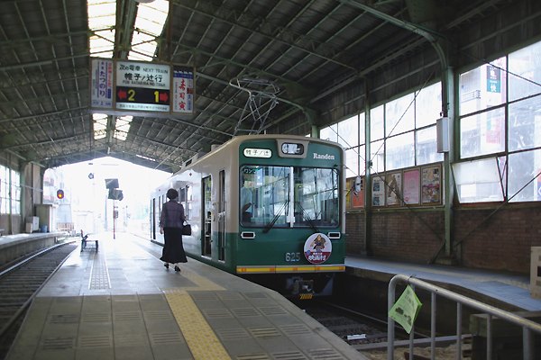 1日券を買ったんで、先ずは終点嵐山まで行っちゃいました。駅舎の方は詰まんない 造りでガッカリだったけど、ホームの上屋や梁は中々の趣でございました。ホームに 停まってんのは、アッシが乗って来たモボ622箱はモダンになっちゃてるけど、実際は 戦前製モボ121形の更新車なんで、バリバリの吊り掛け車なのです。京紫が標準色と なっちまった嵐電ですが、ヤッパ単色よっか緑とクリームのツートンの方が良いやね。 京福嵐山本線 嵐山