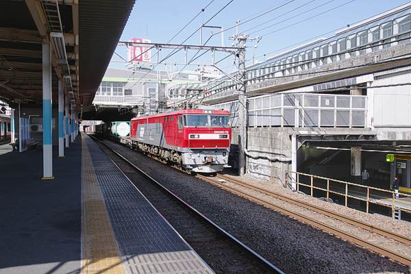 トンネルを出て下り貨物線を通過するEH500 78号機。アッシみたいに写り込みなんて 気にしなきゃ、武蔵野線旅客用ホームにいりゃ、上り列車も駅撮り出来ちゃいます。 でも、写ってる旅客列車用到着ホームに列車停車中に貨物レが、接近通過しちゃうと 2019-2