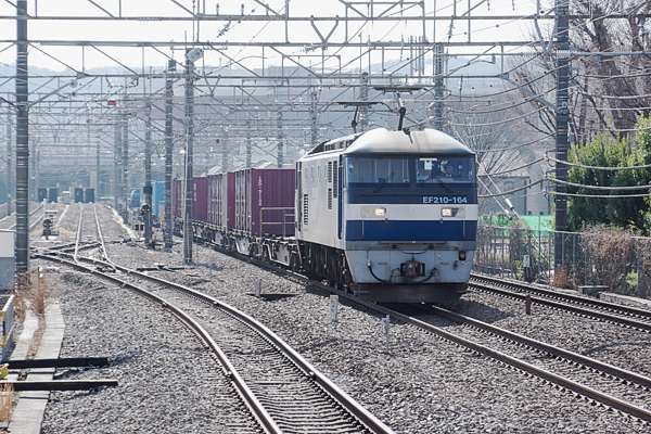 貨物レを駅撮りするにゃピッタシのロケーション、武蔵野線旅客列車起点と南武線の 接続駅府中本町でございます。その府中本町武蔵野線旅客用2・3番線島式ホーム 鶴見方面ホーム端からのスナップをアップでございます。先ずは、武蔵野線の定番 EF210+コキ編成下り貨物列車を逆光ぎみでも関係無く、来たから撮ったの1枚です。 2021-1