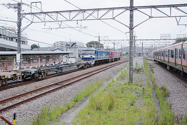 武蔵野線から府中本町上り側に在る、両渡りを通過して南武線に入って来た貨物レ。 EH200が本務なんで、おそらく立川から中央西線に入って行先は、竜王か南松本か? 2022-9