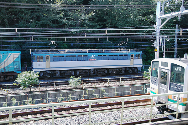 次もなぜか山の手貨物線を走行中の単機PF型、1110号機と同じ東京機関区に新製 配置されたけど、国鉄解体後もJR貨物に売っ飛ばされず、JR東日本所属となり今も 「田」の庫札を挿している、白プレートの1103号機でございます。でも、定期運用無し。 中央本線 山手線 新宿 2009-8