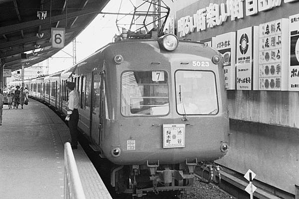 向かい側東横線下りホームにゃ、旧7000形急行桜木町行。長方形赤地に白抜きの 急行種別札も懐かしいですね。一見クーラーに見える、ファインデリアも懐かしい。