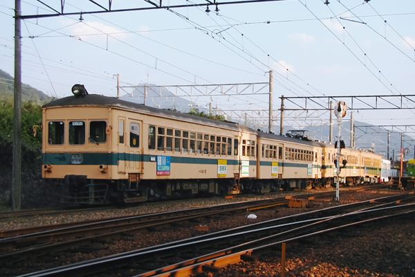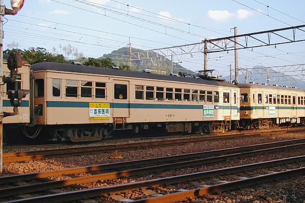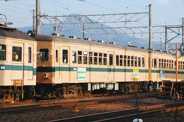 さモハ140形の」後の2両編成は、三河鉄道デ300→名鉄モ3000→福鉄モハ120形の クハ122+モハ122です。ところで、後位のモハ122の台車の色が、灰色になってんの 分かりますか?モハ122の駆動装置は、なんとWN駆動に換装されちゃってたんです。 でも残念ながら、4両の非冷房車は低床車導入で全てお役御免となっちまいました。