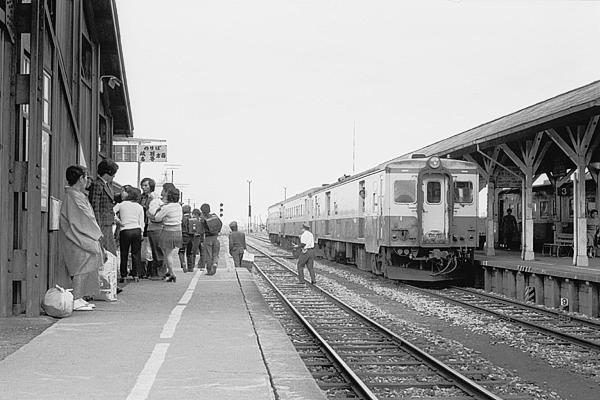 久しぶりの銀塩画像でアップの駅撮りは、松原物故団員撮影の中湧別でございます。 中湧別言えば、霞が関や赤レンガ辺りのお陰か、本線を名乗る線区の中で唯一全線 廃線となった、名寄本線の主要駅の一つでした。また、名寄本線より早く国鉄末期の 1987/3に廃止された湧網線の起点駅、さらに名寄本線湧別支線の起点駅、当駅より 3線が分岐するジャンクションでした。駅の構造は。駅舎南端接し片面ホーム1番線と 跨線橋で結ばれた、島式2・3番線が千鳥状に配置された、南北に長い構内でした。 その島式ホーム2番線に停まってる3両編成下り列車、後2両は当時の道内各線にゃ 履いて捨てるほど居た、キハ22にまず間違い無しでございますが、先頭の気動車は、 道内じゃ3両だけだった10系気動車のレア形式の一つ、キユニ17のトップナンバーで ございます。隣の3番線にも客扱い中のキハ22湧網線網走行きが、停まってますね。