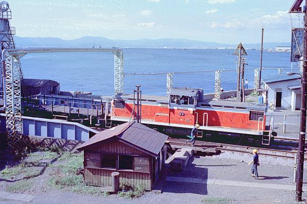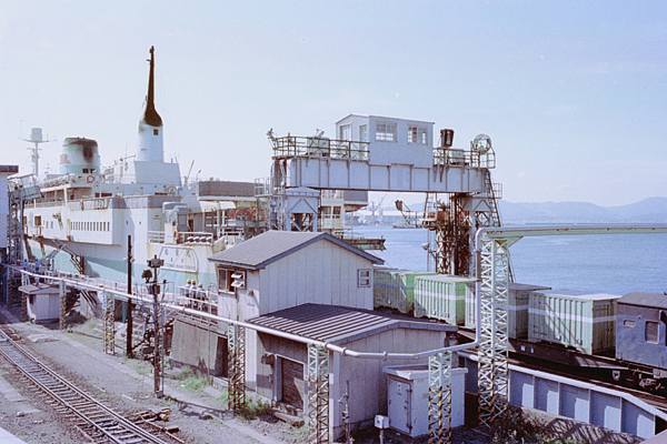 コッチのDD13 214号機の方は、航送貨車引き出し作業中か?稼動桟橋にゃ控車の ヒ600形が、丁度載ってるとこですね。数量のヒ600連結されて引き出されてきたのは、 今は無き車端に緩急室を装備した、コキフ10000形と掲載コンテナ数から推定です。 そして、青森からコキを航送して来た青函連絡船は、1964年初就航の松前丸ですが、 撮影した1年数か月後には引退となり、最後は、ミサイル大好きな将軍様の国に落ち、 かの国の港で朽ちたそうですよ。嗚呼合掌! 青函連絡船・函館本線 函館 1982-8 Photo by 松原の親方 |