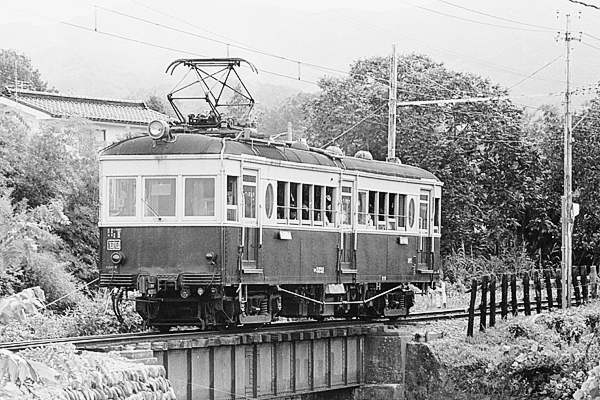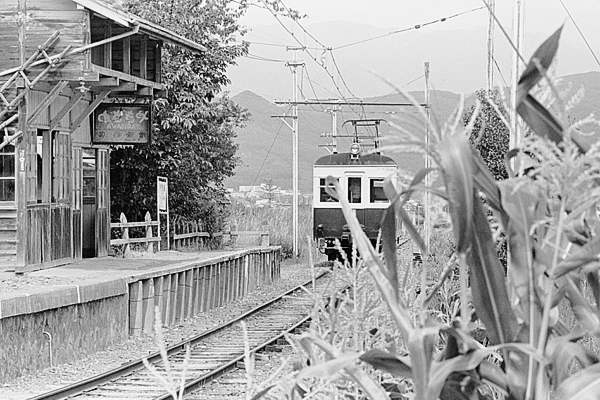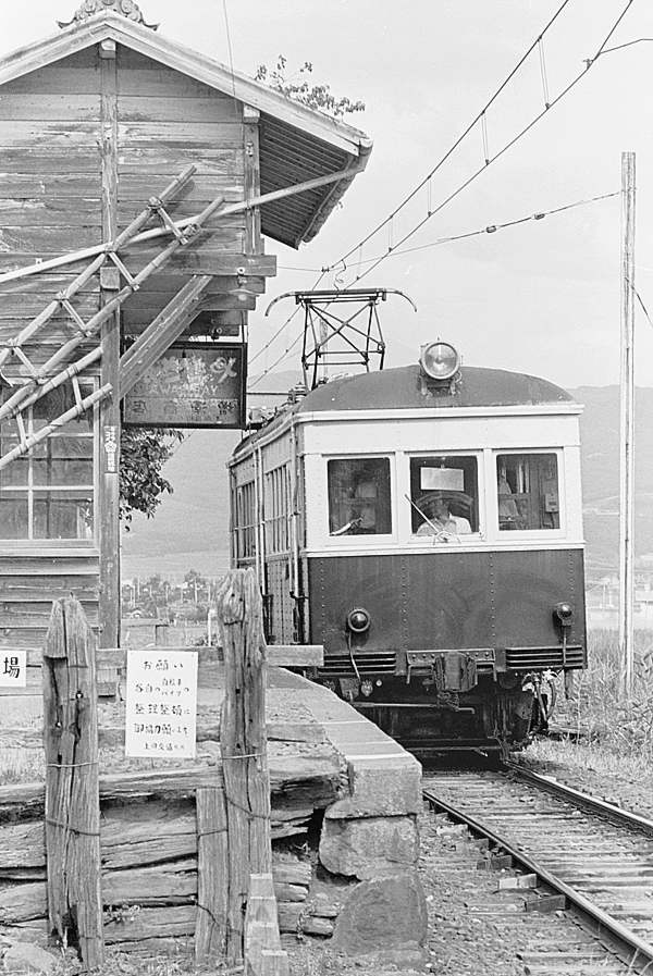 今は東急のセコハン車だけが走っている、上田交通別所線でございますが、昇圧前 750Vの頃は、自社発注丸窓電車モハ5250形や元長電・元買収国電等々、趣味的に 面白い車両が、集まっていました。そんな車両の一つ、信濃鉄道からの買収国電に 小田急1650形の箱を乗っけた、モハ5370形の上り列車が、別所温泉から八木沢に