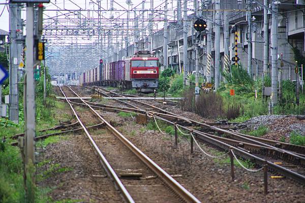 701系が出発すると直ぐ、EH500 32号車牽引貨物レが、海側貨物線通って接近です。