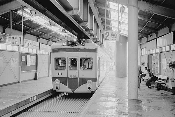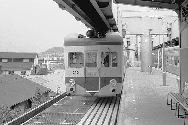 2コマ目は、300形309F出発を少し引いて左側からの撮った、当時の湘南モノレール 大船駅ホームほぼ全景カットでございます。このカット見てアレェ?なんか違うぞっと、 違和感を覚えたアナタは、本物の駅撮りファンでございます。列車と正対した位置に 写り込んだラッチの一部、今と正反対の乗降ホームってな画像から考えられんのは、 開業から何年間か経ってから駅舎が、建替えられたんじゃないかってぇ答えですね。 で、ググるてぇっと、1992/6に新しくなってました。よく見っと、壁もプレハブぽいやね。