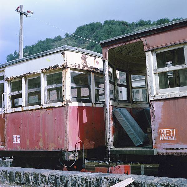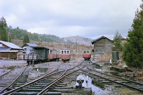 前回に引き続きまして、今回も富山の迷鉄氏撮影の6X6カラーネガから、アッシ等が イメージする軽便の魅力を最後まで残し、1977/3にその幕を閉じた、尾小屋鉄道の 終点尾小屋駅撮りをアップです。先ずは、廃止を数か月後に控えた、尾小屋構内の ほぼ全景でございます。画面の右側にゃ、駅本屋とホ−ム、そのホームに停まって