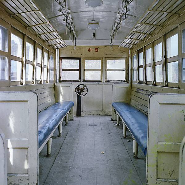 ホハフ5号車の車内です。最前部に見えるハンドブレーキと全面窓上部に記入された、 割と大きめホントの「ホ-5」の形式記号が、是ぞ軽便って感じで実に好ましいのです。